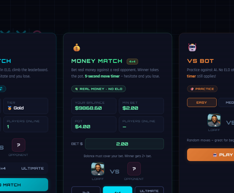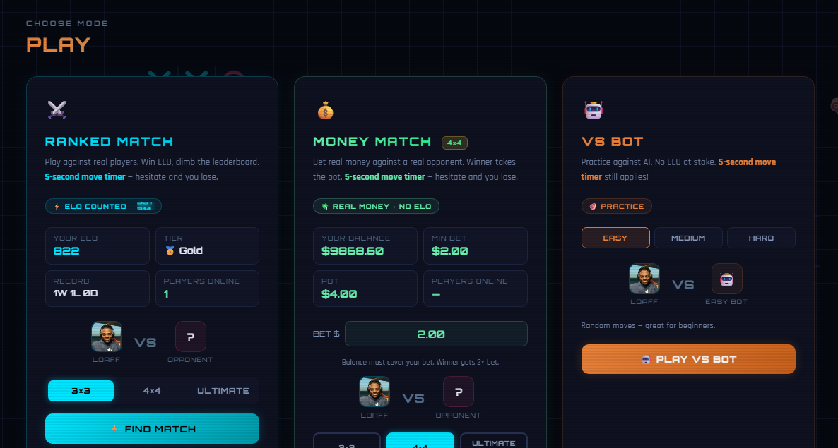 Ranked Tic Tac Toe with real cash prizes coming soon, be one of the first to check us out when we launch!